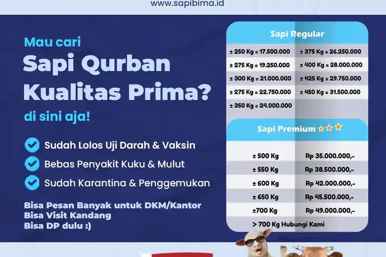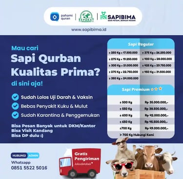 Insya Allah rekanan SOHIBku menjamin kepuasan pelanggan dan keamanan dalam mengonsumsi hewan Qurban, sehingga hewan yang mitra SOHIBku sediakan dalam kondisi PRIMA. 🐂